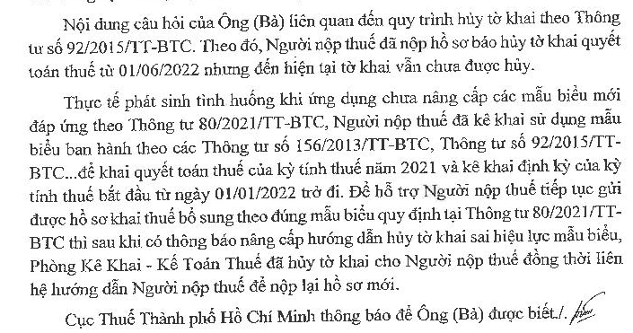 Kính gửi Tổng Cục Thuế Tôi có nộp hồ sơ QT thuế TNCN năm 2021, tuy nhiên tôi đã nộp theo TT92 và bị báo lỗi; tôi được hướng dẫn làm đơn yêu cầu Cục thuế Hồ Chí Minh huỷ tờ QT theo TT92 để nộp lại theo TT19. Tuy nhiên, tôi đã nộp hồ sơ báo huỷ từ ngày 01/06/2022 nhưng đến hiện tại tờ khai QT theo TT92 của tôi vẫn không được huỷ. Tôi muốn hỏi quy trình huỷ tờ khai theo TT92 có phải mất nhiều thời gian như vậy không, tôi đã liên hệ Phòng Kê Khai của Cục Thuế Hồ Chí Minh nhưng không nhận được sự giúp đỡ nào. Cám ơn
