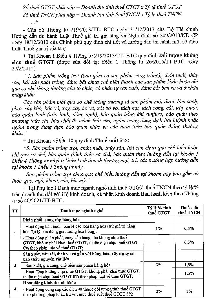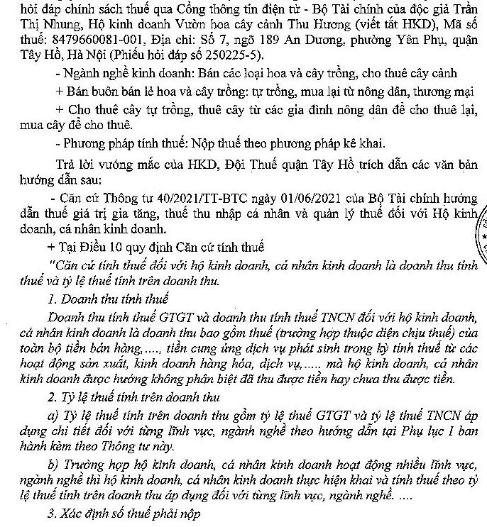 Kính gửi bộ tài chính và cục thuế: tôi là hộ kinh doanh dùng hóa đơn bán hàng chuyên bán buôn bán lẻ các loại hoa và cây tròng, kể cả cây cảnh và cây làm giống, cho thuê cây cảnh (cây đào và dịp tết). Vậy cho tôi hỏi - Hộ kinh doanh của tôi sẽ bị áp những loại thuế nào? - Thuế suất áp dụng đối với bán buôn bán lẻ hoa và cây trồng là bao nhiêu % ( có cả hoa và cây trồng tự trồng, có cả hoa và cây trồng mua lại của các gia đình nông dân)? - Thuế suất áp dụng đối với cho thuê cây cảnh ( cây đào tết) là bao nhiêu % ( có cả cây do gia đình tự trồng, và cây thuê lại của các gia đình nông dân khác, cho thuê không bao gồm dịch vụ chăm sóc)? - Hoa và cây trồng cũng như cây đi thuê của các gia đình nông dân để bán và cho thuê lại không có hóa đơn đầu vào. Vậy tôi sẽ sử dụng những hồ sơ giấy tờ cần thiết gì và như thế nào để có thể phù hợp với hoạt động kinh doanh của hộ kinh doanh? Trân trọng cảm ơn và mong sớm nhận được sự phản hồi.