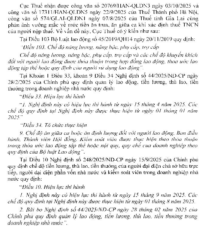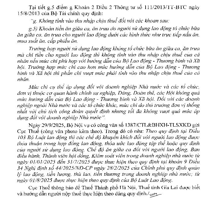 Trong thời gian gần đây, chính sách, pháp luật thuế có nhiều sự thay đổi liên quan đến thuế GTGT, TNCN và TNDN. Nhằm giúp cho người dân, doanh nghiệp hiểu, nắm bắt và thực hiện đúng chính sách pháp luật thuế, tôi có một số thắc mắc, mong Bộ Tài chính hướng dẫn, giải đáp như sau: Đơn vị chúng tôi thực hiện chế độ lương theo hình thức khoán sản phẩm, không tổ chức bữa ăn giữa ca mà chi tiền ăn ca trực tiếp cho người lao động. Theo Quy chế Tài chính của Công ty, giá trị tiền ăn ca một ngày chi cho một lao động không thấp hơn 50.000đ/ người/ ngày và không vượt quá 150.000đ/người/ngày. Nếu làm thêm giờ thì được hỗ trợ thêm tiền ăn ca trong thời gian làm thêm tối đa bằng 1,5 lần mức tiền ăn ca làm trong giờ. Tùy tình hình thực tế giao cho Giám đốc doanh nghiệp quyết định mức chi trong hạn mức trên. Trước ngày 15/6/2025, khoản tiền ăn giữa ca này nếu chi vượt 730.000đ/người/tháng thì phần vượt phải đưa vào tính thuế TNCN cho người lao động. Từ ngày 01/7/2025, giả sử Công ty thực hiện chi trả tiền ăn ca theo mức 150.000đ/người/ngày. Nếu làm thêm giờ, làm ngoài giờ thì được hỗ trợ thêm một khoản tiền ăn ca tương đương với mức làm trong giờ thì khoản thu nhập này người lao động có phải chịu thuế Thu nhập cá nhân không? Doanh nghiệp có được tính vào chi phí được trừ khi tính thuế TNDN không ? Đơn vị thực hiện trả lương khoán sản phẩm. Giả sử giao khoán cho một số cá nhân thực hiện làm ngoài giờ một số công việc thì phần thu nhập ngoài giờ này có chịu thuế TNCN không. Hồ sơ đưa vào hạch toán bao gồm những gì và khoản chi lương này có được đưa vào chi phí hợp lệ của đơn vị hay không?