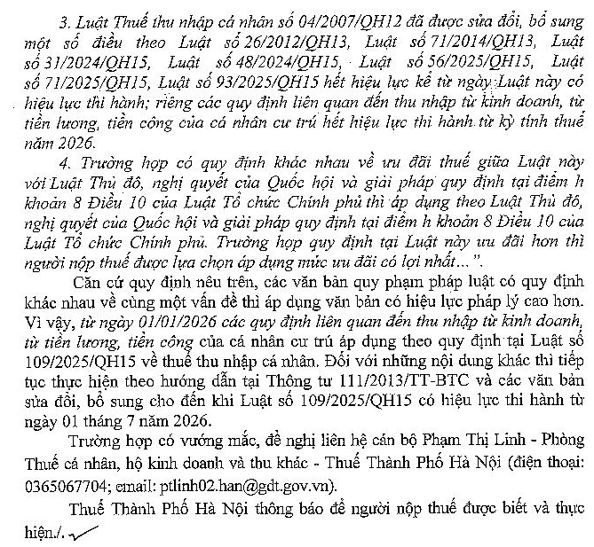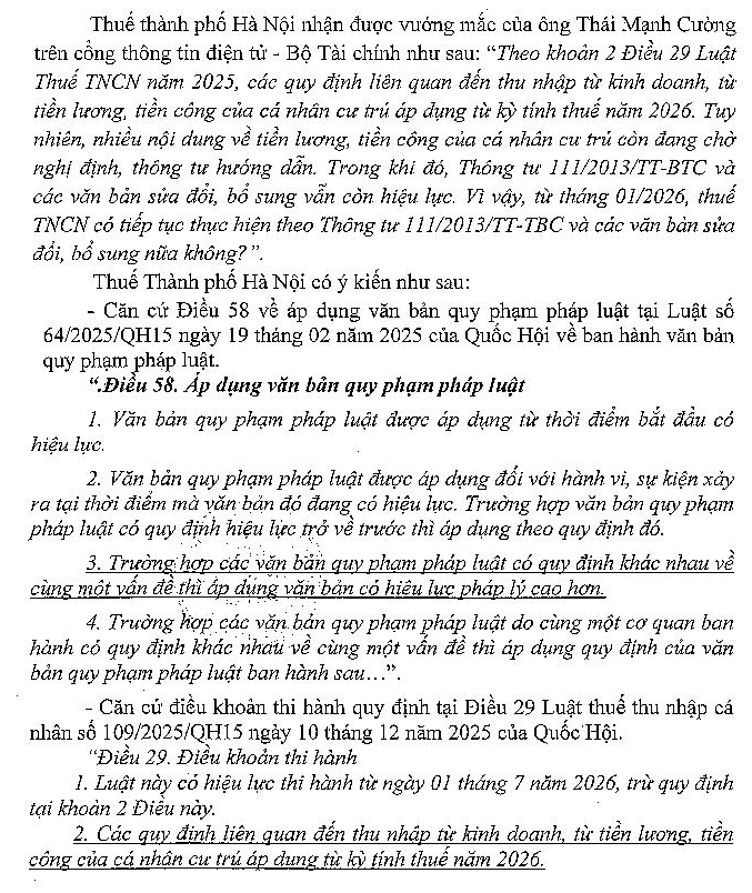 Kính gửi: Bộ Tài chính Theo khoản 2 Điều 29 Luật Thuế TNCN 2025: Các quy định liên quan đến thu nhập từ kinh doanh, từ tiền lương, tiền công của cá nhân cư trú áp dụng từ kỳ tính thuế năm 2026. Tuy nhiên, nhiều nội dung về tiền lương, tiền công của cá nhân cư trú còn đang chờ nghị định, thông tư hướng dẫn. Trong khi đó, Thông tư 111/2013/TT-BTC và các văn bản sửa đổi, bổ sung vẫn còn hiệu lực. Vậy cho tôi hỏi, từ tháng 01/2026, thuế TNCN có tiếp tục thực hiện theo Thông tư 111/2013/TT-BTC và các văn bản sửa đổi, bổ sung nữa không?