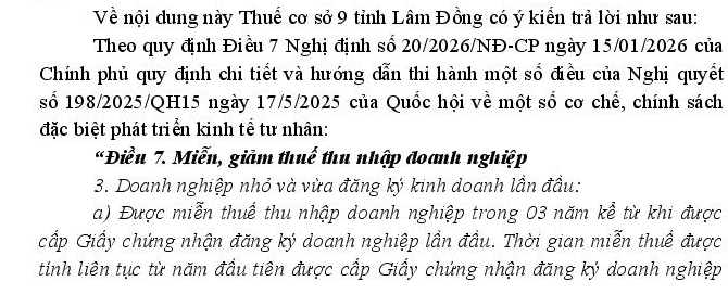Xin hỏi BTC: Chồng tôi là chủ hộ kinh doanh hoạt động lĩnh vực thương mại, dịch vụ mua bán hàng hóa, thiết bị điện tử từ năm 2016. Đến tháng 5.2025 chồng tôi làm thủ tục chấm dứt hoạt động hộ kinh doanh, sau đó thành lập công ty TNHH 1 thành viên do chồng tôi làm chủ sở hửu cũng vào tháng 5.2025, cũng hoạt động lĩnh vực như hộ kinh doanh cũ và đăng ký kinh doanh tại địa điểm của HKD cũ luôn. Công ty đáp ứng các tiêu chí doanh nghiệp nhỏ và vừa. Vậy xin hỏi BTC theo Nghị định 20/2026/NĐ-CP và Nghị quyết 198/QH15 thì trường hợp công ty của chồng tôi là giả thể HKD và thành lập doanh nghiệp trong cùng 1 năm, hoạt động tại cùng một địa điểm kinh doanh và cùng ngành nghề, cùng 1 người chủ sở hửu thì có được hưởng ưu đãi thuế TNDN 03 năm đầu không? Tôi có hỏi cán bộ thuế khu vực về trường hợp công ty chồng tôi tình trạng như trên nhưng cán bộ thuế trả lời do cùng 1 người đại diện pháp luật, cùng 1 địa điểm kinh doanh, cùng 1 ngành nghề kinh doanh nên không được miễn thuế TNDN 3 năm đầu. Tôi đọc trong Nghị định 20/2026/NĐ-CP và Nghị quyết 198/QH15 thì không nhắc tới trường hợp như cán bộ thuế khu vực giải thích. Xin BTC trả lời rõ giúp tôi vấn đề này Xin cảm ơn!